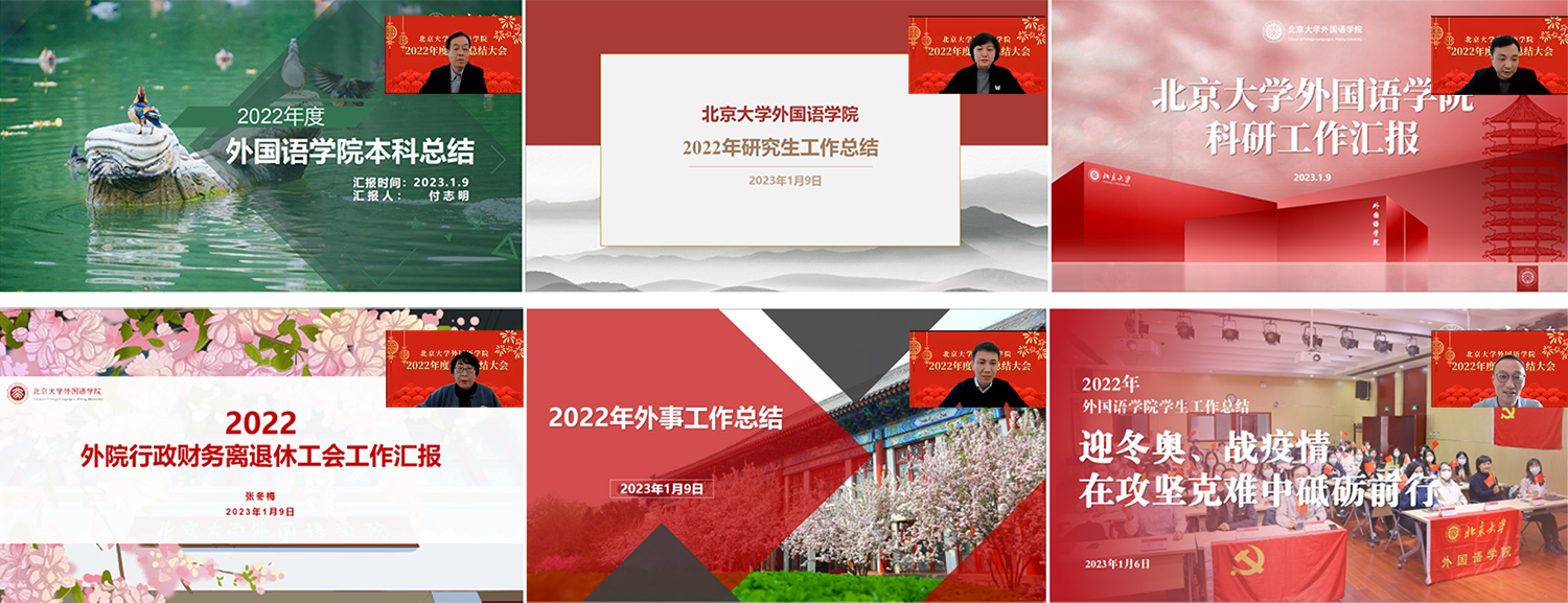 院长陈明对学院全年的工作进行了总结。2022年,学院师生团结一心、共克时艰,各项工作稳步推进,取得了优异的成绩。学院紧抓放权改革机遇,编制《外国语言文学学科放权改革方案》,明确了北大外语学科的阶段性建设目标。学院坚持党对人才工作的全面领导,深化教师人事制度改革,制定《九州官方网站,九州jiuzhou(中国)人才发展战略》,系统开展引才、育才、选才工作,多措并举、强化引领。打造“院长茶座”“青年教师座谈会”“学科建设沙龙”等品牌活动,促进青年教师职业生涯发展。在教育部第五轮一级学科评估中,北大外语学科保持领先,翻译专业学位在全国专业学位水平评估中表现优异,彰显了学院的引领地位。申丹教授荣聘中国人力资源保障部批准聘任的国家文科一级教授,段晴教授领衔的“东方语言文化教师团队”入选教育部第二批全国高校黄大年式教师团队,赵振江教授荣膺中国翻译界最高荣誉“翻译文化终身成就奖”……无数荣誉的取得无不体现着学院教师深厚的积累与持续的爆发力,以及学院风清气正、勠力同心的学术生态。他希望新的一年,全院教师能够精诚合作、团结一心、各尽其能,共同谱写北大外语学科发展的新篇章。