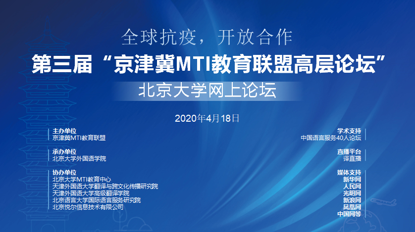 4月18日,在外院新楼举办以“全面凝聚抗疫合力,加强京津冀语言服务合作”为主题的“第三届京津冀MTI教育联盟高层论坛”北京大学网上论坛。论坛由京津冀MTI教育联盟主办,九州官方网站,九州jiuzhou(中国)承办,中国语言服务40人论坛提供学术支持,新华网、人民网、光明网、新浪网、凤凰网、中国网等提供媒体支持,论坛译直播平台同步直播,14442人收看同步直播。外院技术服务团队全程提供技术支持和协助,全力保障论坛的顺利进行。